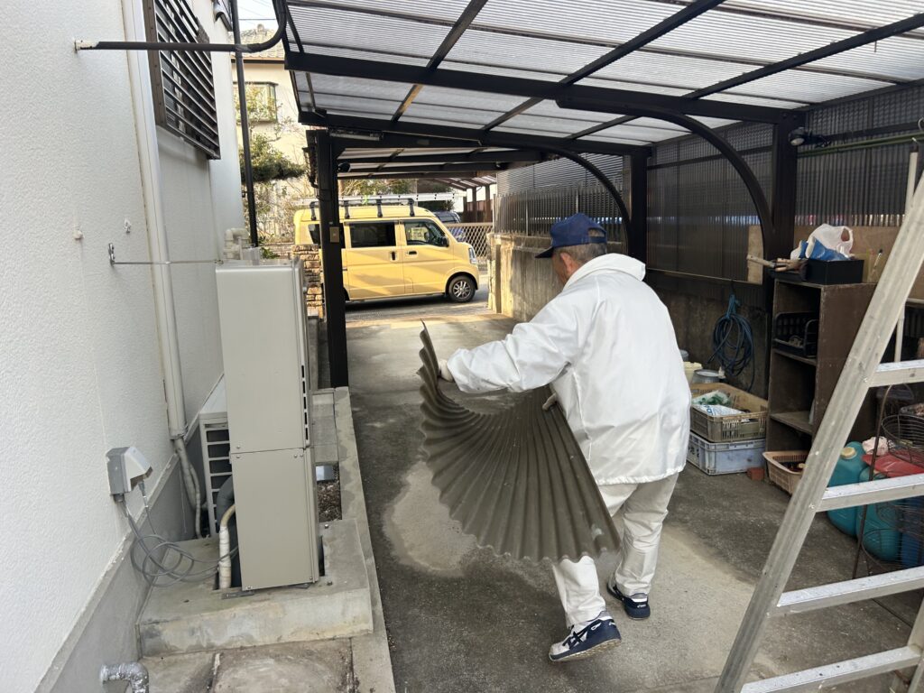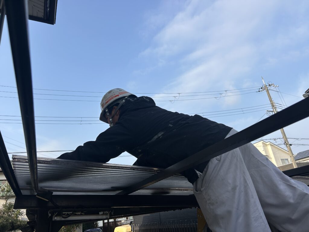 今朝は8時30分前にお伺いし、足場職人が到着するまでの1時間で、波板の撤去と荷物移動を完了させました。長年の付き合いである「米たんコンビ」の息の合った動きは、流石の一言です!