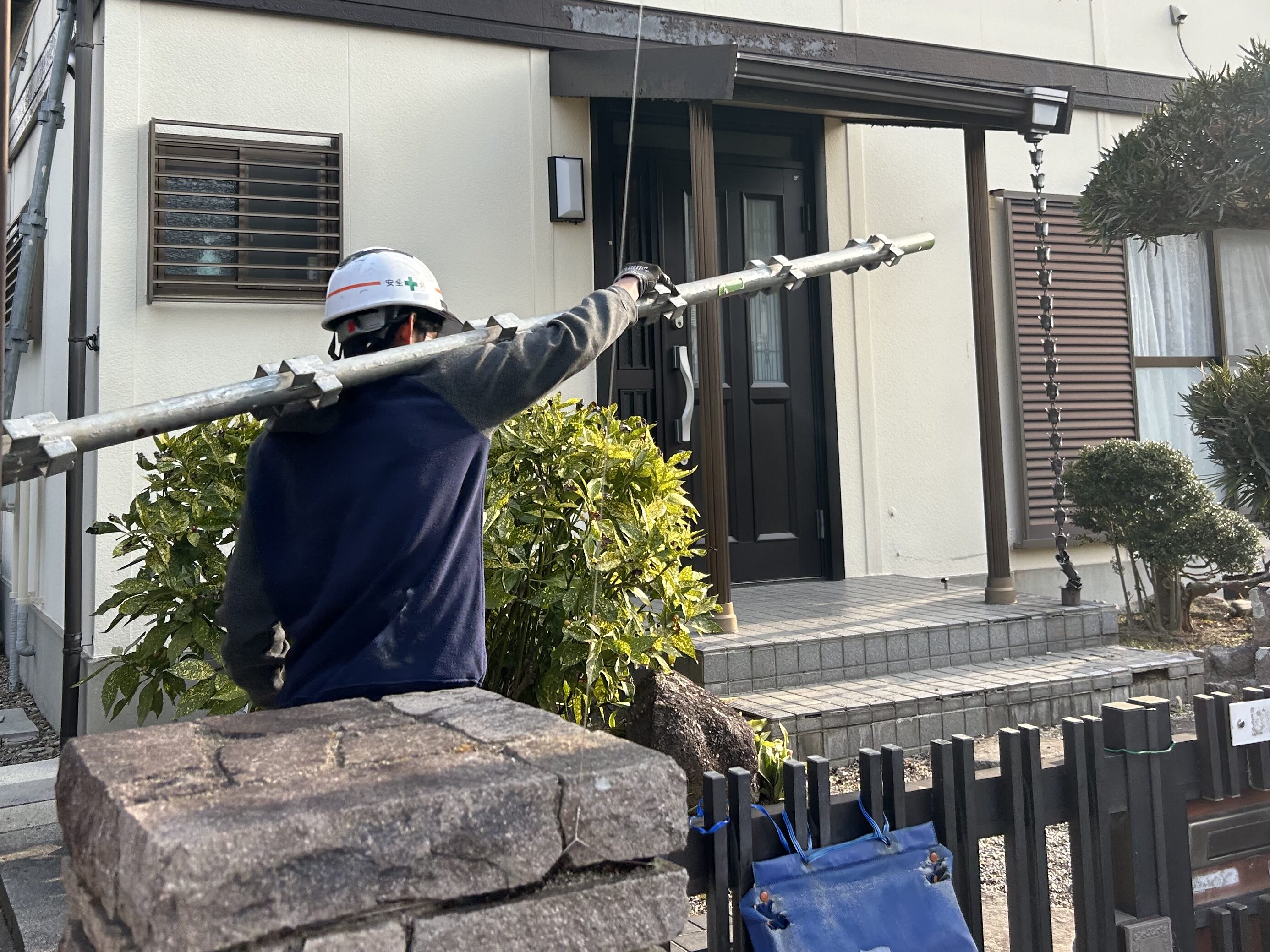 慣れていなければ2時間はかかる作業ですが、あっという間に足場親方に引き継ぐことができました。足場組立も、ただ組めばいいわけではありません。安全はもちろん、近隣さまへの配慮、そして「塗装作業がしやすい高さ」をしっかり考えて、スピーディに進めてまいります。