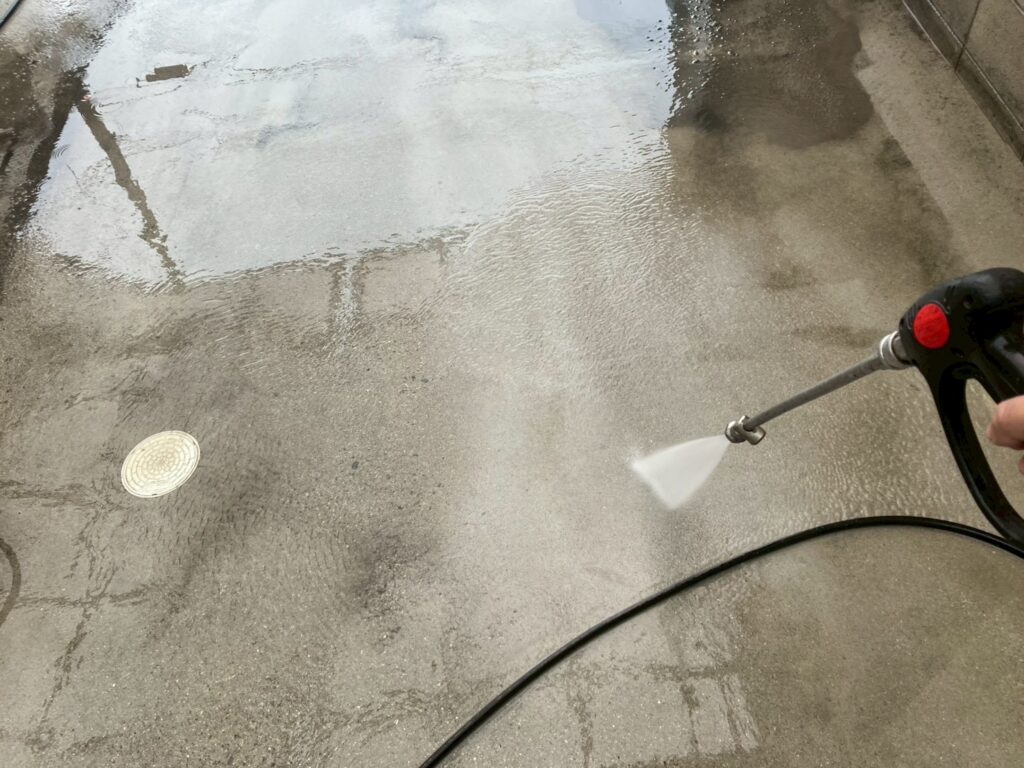 ↓意外と汚れている、回りへの飛散も配慮しながら、車の守護神・カーポートも洗浄しました。