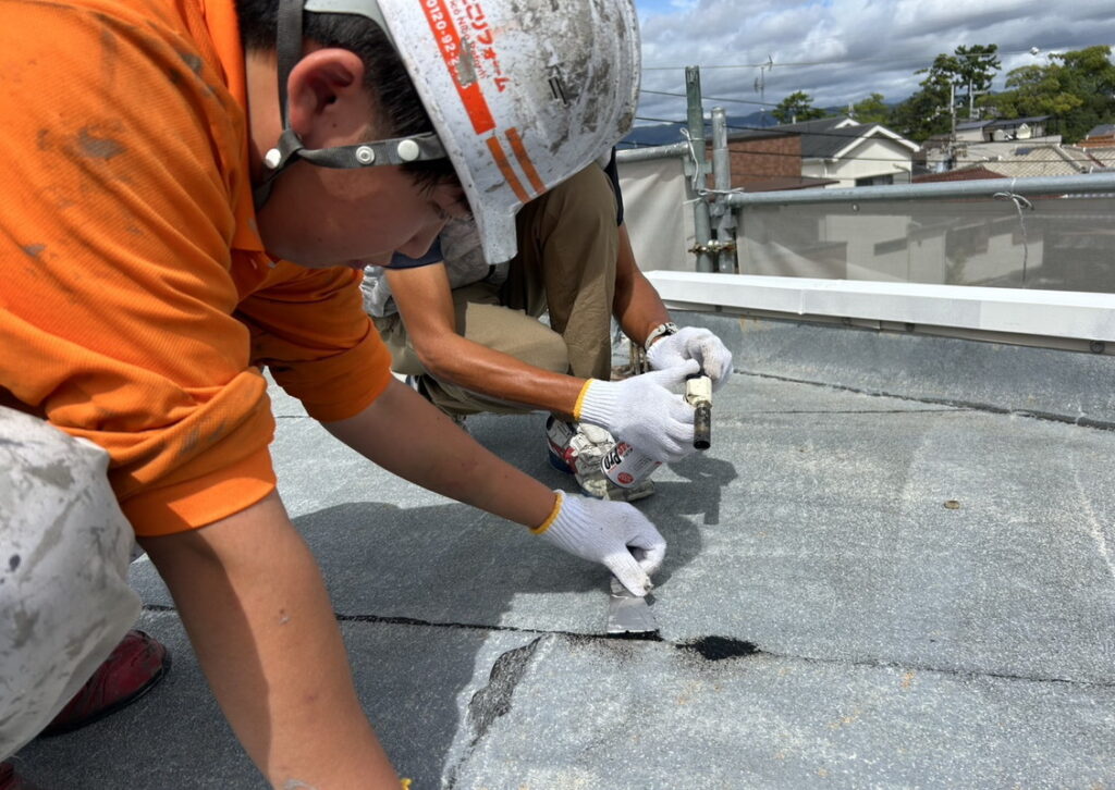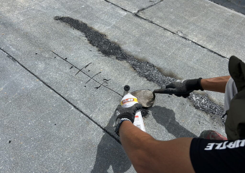 現場親方ブログ2025.09.13伊丹市 ビル屋上 アスファルト防水補修屋上 アスファルト防水補修こんにちは!にこにこ防水班です本日は伊丹市にあります、ビル屋上のアスファルトの防水補修を行っております。専用の道具を使って丁寧に補修しております。