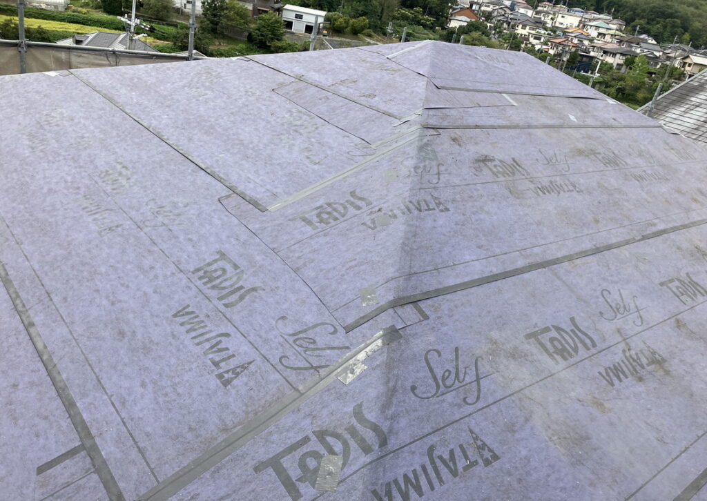 正式名称はアスファルトルーフィングといいます。防水シートのことです。しっかり貼り付けないと雨漏りの原因になります。