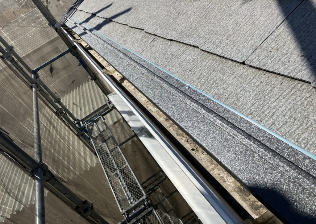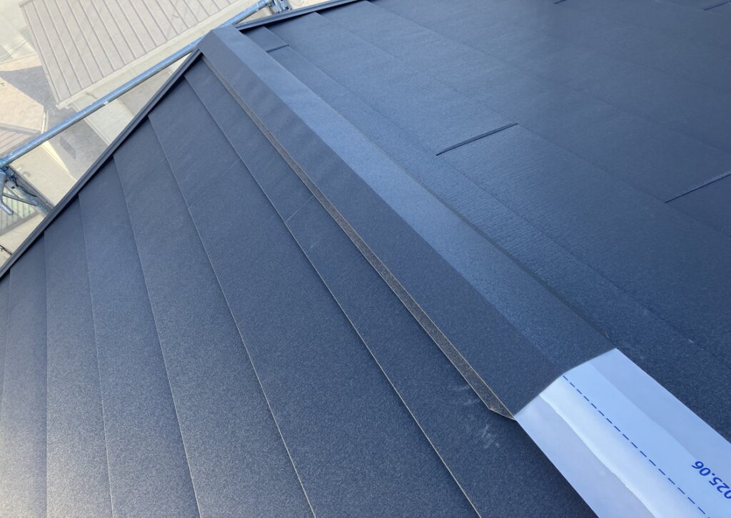 縦ラインの先端部分から雨水が入ってこないようにする為の物です。唐草同様ルーフィングに隙間が入らないように取付します。