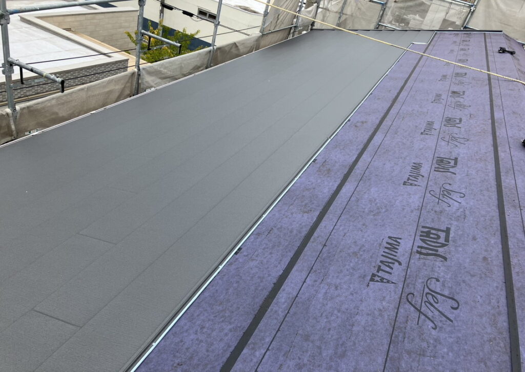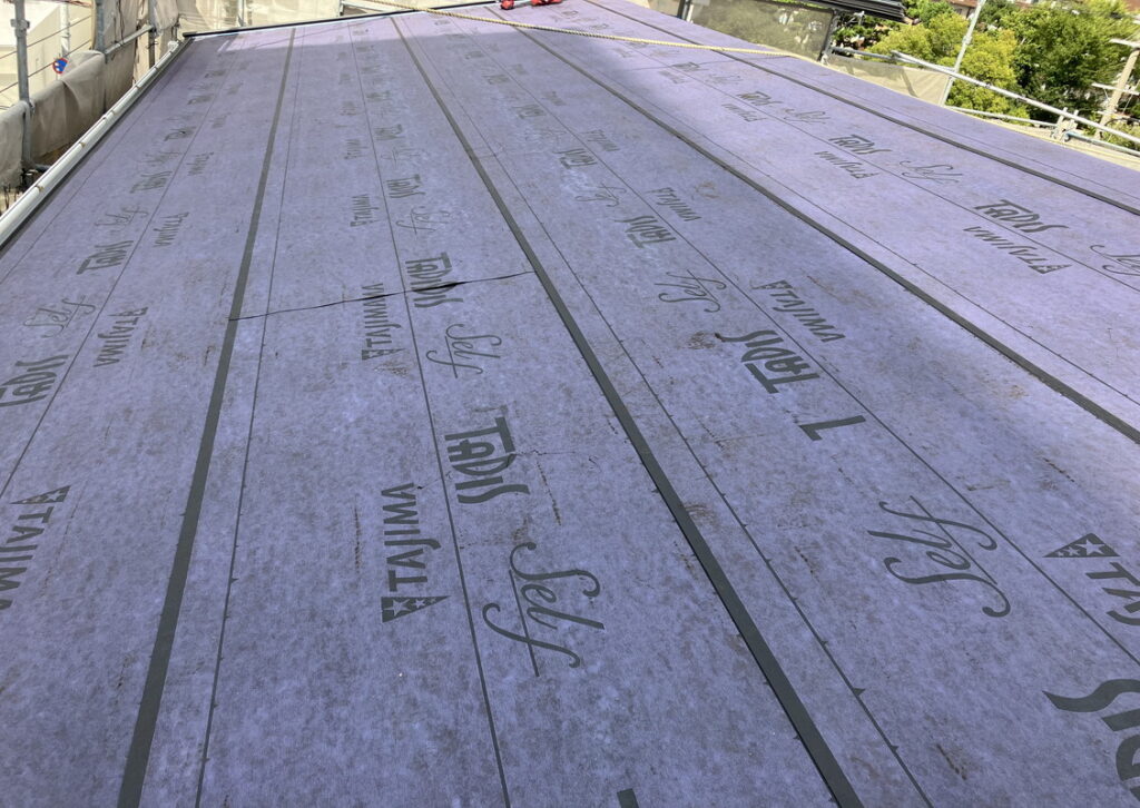 正式名称はアスファルトルーフィングといいます。防水シートのことです。しっかり貼り付けないと雨漏りの原因になります。