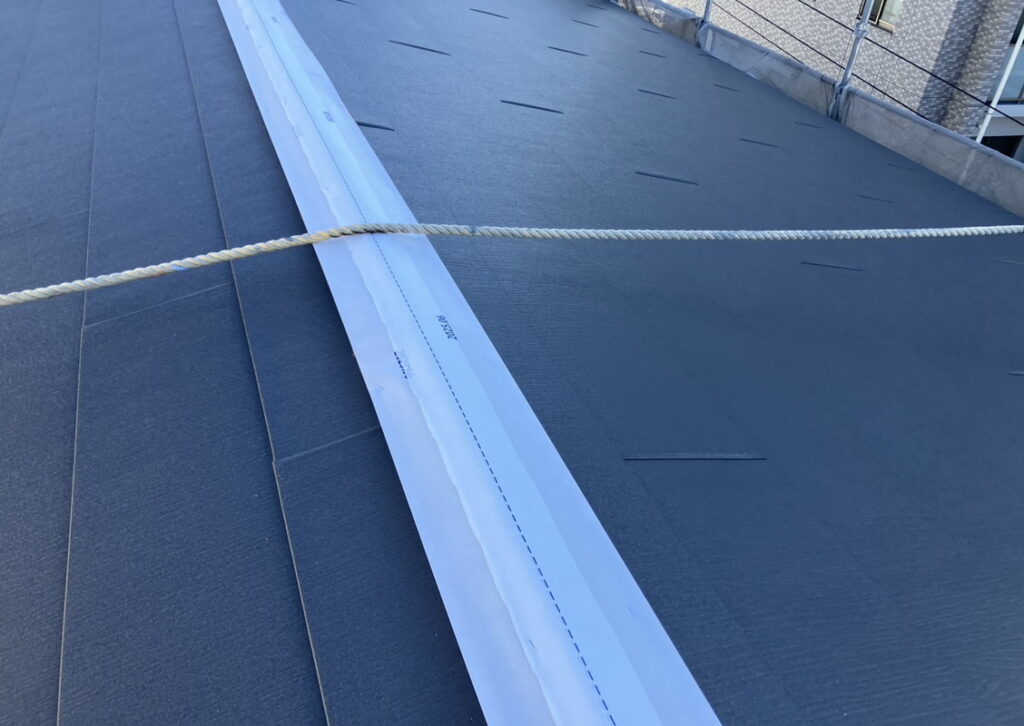 横ラインの先端部分から雨水が入ってこないようにする為の物です。ルーフィングに隙間が入らないように取付します。