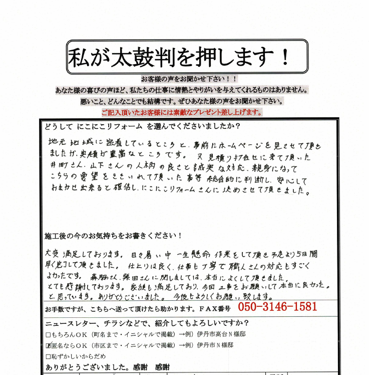 地元地域に密着しているところと、事前にホームページを見せて頂きましたが実績が豊富なところです。又、見積り打ち合せに来て頂いた井町さん、山下さんの人柄の良さと誠実な対応、親身になってこちらの要望をききいれて頂いた事等、総合的に判断し、安心してお任せ出来ると確信し、にこにこリフォームさんに決めさせて頂きました。