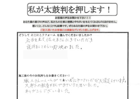 口コミ評判O様 カスタマーレビュー ★★★★★ Q. どうしてにこにこリフォームを選んでくださいましたか? 昔から近所で見ていました。対応も早く、親切で理解し易い説明で安心しました。見積も明確でした。職人様も細かく対応してもらいま...