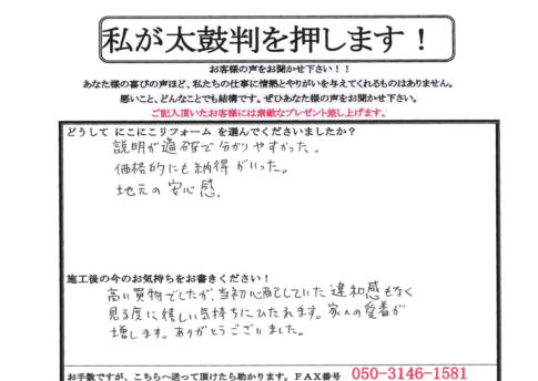 口コミ評判川西市 T様 お客様の口コミをご紹介! Q. どうしてにこにこリフォームを選んでくださいましたか? 説明が適確で分かりやすかった価格的にも納得がいった地元の安心感 Q. 施工後の今のお気持ちをお聞かせください。 高い買い...