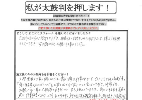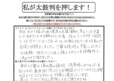 口コミ評判H様お客様の口コミ紹介! カスタマーレビュー ★★★★★ Q. どうしてにこにこリフォームを選んでくださいましたか? 地元の施工業者であり、工事見積りも代金や塗装色合い等プロの意見を聞きながら、和やかなうちに決定出来た。...