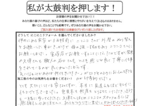 口コミ評判宝塚市T様お客様の口コミ紹介! カスタマーレビュー ★★★★★ Q. どうしてにこにこリフォームを選んでくださいましたか? ポストに投函されたチラシの印象が良かったので。「3度塗り」という言葉に惹かれました。熱い思いも興...
