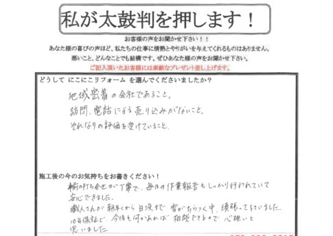口コミ評判宝塚市M様 カスタマーレビュー ★★★★★ Q. どうしてにこにこリフォームを選んでくださいましたか? ・数社見積合せをした内で、一番真面目で好感を持てた。・価格的にも納得がいった。 Q. 施工後の今のお気持ちをお聞かせ...