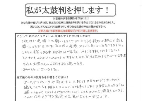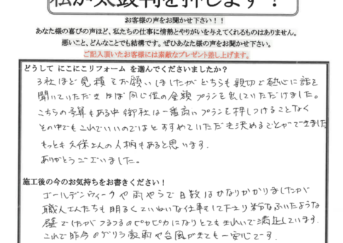 口コミ評判宝塚市K様お客様の口コミ紹介! カスタマーレビュー ★★★★★ Q. どうしてにこにこリフォームを選んでくださいましたか? ①お二人とも、にこにこ対応で、色々な要望、相談がしやすかった。②価格面も、適切な価格でした。 Q...