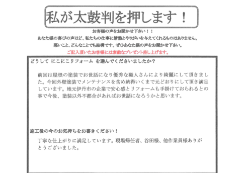 「Y様。この度は工事をさせて頂き誠にありがとうございました。 安全面にいつも気を使って頂き職人全員が怪我をする事なく工事を無事に終えることができました。 安全帯の使用に関してはこれから徹底させて頂きます。ご指導ありがとうございます。 また何かあればお気軽にお声掛けください!」