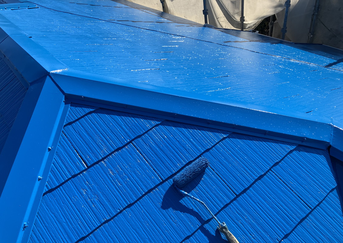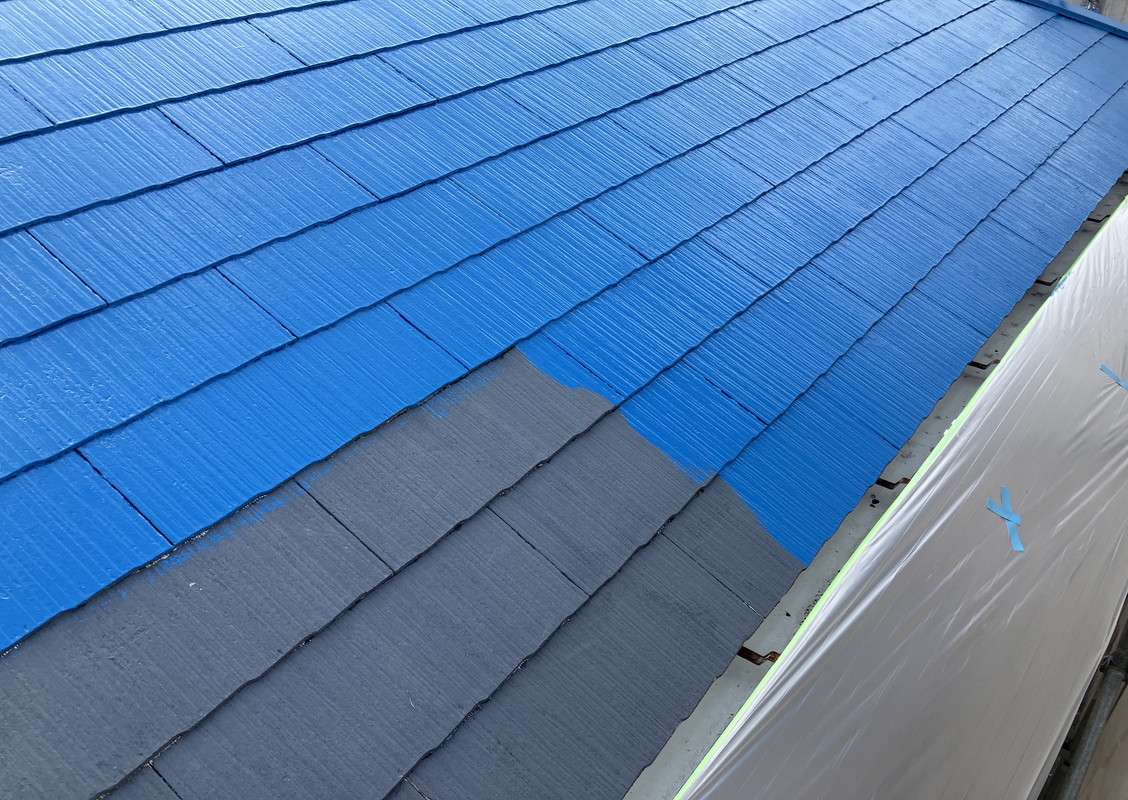 そして、次は、いよいよ中塗りです。今回は、お客様が選んでくれた青ですね。塗料はバイオマスです。