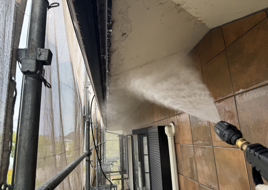 塗装の前に高圧洗浄で、コケや汚れ、黒ずみ、旧塗膜等をしっかり落としていきます!高圧洗浄でしっかりと旧塗膜や汚れを落としておくことで、塗料の密着性を良くする効果を発揮できるからです。