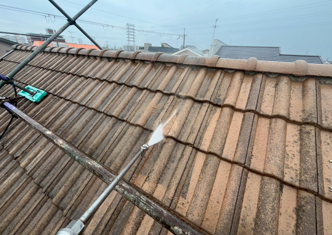 塗装の前に高圧洗浄で、コケや汚れ、黒ずみ、旧塗膜等をしっかり落としていきます!高圧洗浄でしっかりと旧塗膜や汚れを落としておくことで、塗料の密着性を良くする効果を発揮できるからです。