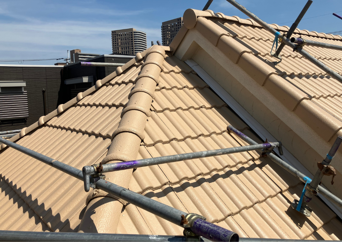 外壁や屋根が綺麗になっていくに様子は感動の塗り替えリフォームの始まりです。夏はとても楽しい仕事でもありますが、寒い冬は身体もびしょ濡れになり大変な作業でもありますが、職人さんは外壁から屋根にあがり手際よく作業していきます。