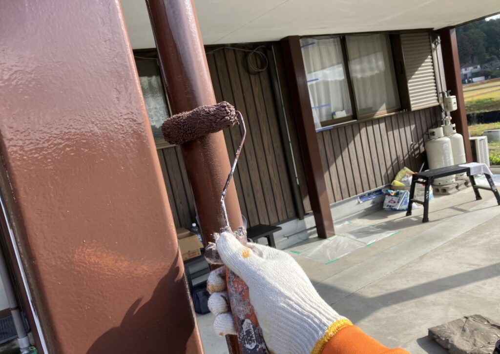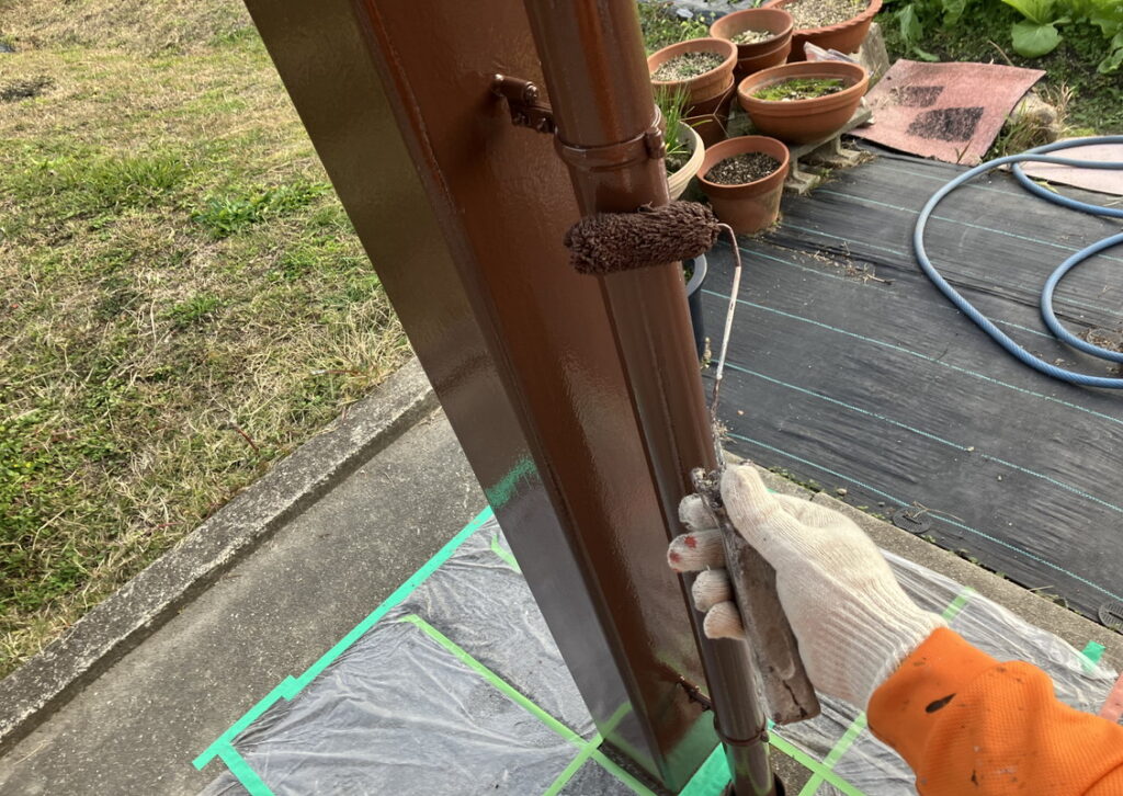 外壁屋根塗装同様、全体をしっかり高圧洗浄とケレンをしたら、1回目の塗装です。下塗り(したぬり)といいますが鉄部の場合は。さび止めをぬります。外壁塗装同様、原則、下塗り(さび止め)、中塗り、仕上げ塗り(上塗り)の3回です。(下写真)